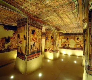 A few meters away, the "vine tomb" of Sennefer, governor of Thebes, features four pillars and superb decorations. The walls feature murals depicting the rituals of the passage to eternal rest, including the offering of amulets, purifications, invitation to a meal, the journey to Abydos, rebirth, etc., all recreated via surface photo transfers created by the company that has already reproduced a room from the Lascaux caves.