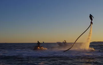 Have you always dreamed of putting on a superhero costume? This invention lets you stand above the waves for a few minutes. The boldest will make figures, for example by diving into the water like a dolphin. The principal is simple: you climb onto a board attached to a turbine that, by producing a powerful jet of water, propels you a few metres into the air.