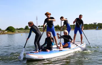 You've heard of stand-up paddle boarding, now it's time for giant stand-up paddle boarding! On a much bigger, 5-metre-long and 2-metre-wide pneumatic board, boarders paddle, joyfully battling with the waves as they surge forward. It's basically sea rafting, with the option of kneeling on the board, which can carry up to ten people.
